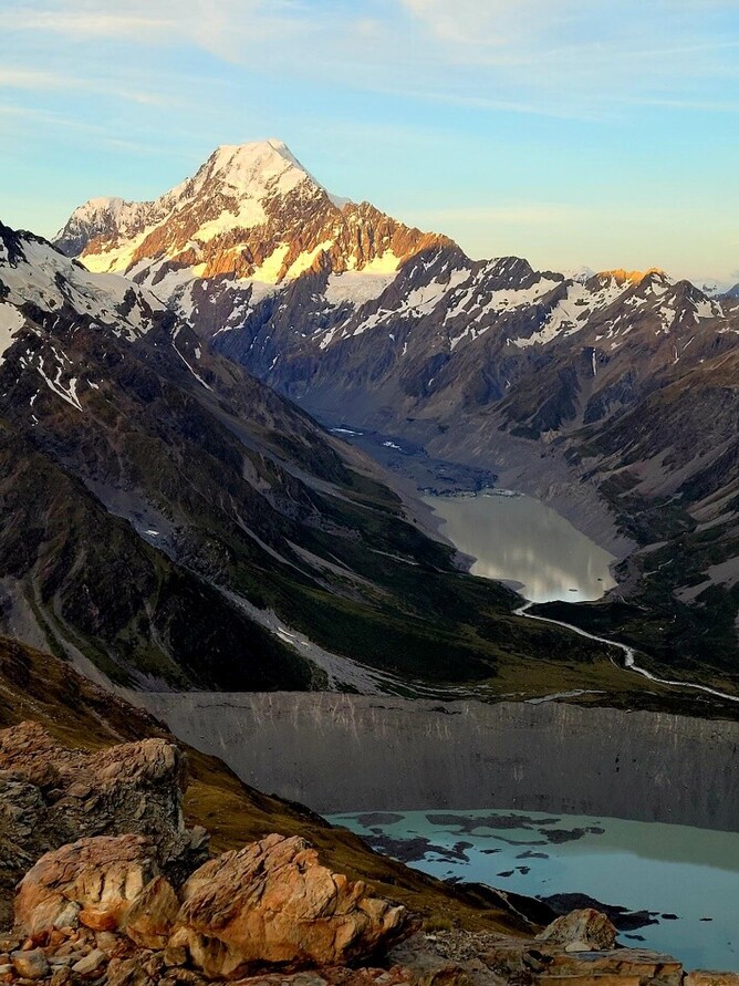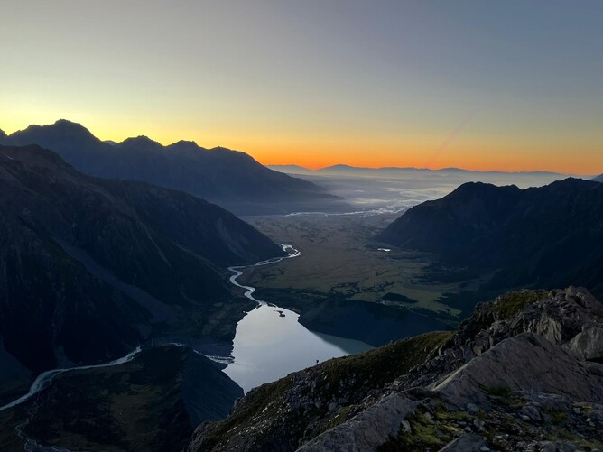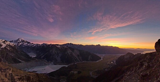 This is my absolute favourite view and you can see why from the photos. Whether sunrise or sunset you are treated to a magical show with so many colours. The reason I favour this over Sefton Bivvy is that you also get a view of Aoraki/Mount Cook which is hidden when you are at the Bivvy. As the highest Peak in New Zealand the sun catches the summit at golden hour and creates something pretty special. It is a reasonably challenging walk with a lot of steps and a more technical section at the end, so again make sure conditions are good and that you have the skills required before heading up. The hut is bookable and there are also plenty of camping spots up here, so you can walk up just beyond the hut and enjoy a slightly quieter view of the show if being around lots of people isn’t for you.