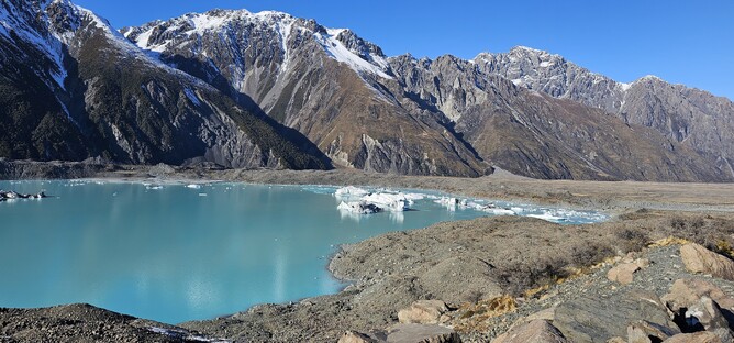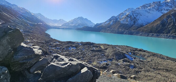 I was here in mid-July, so the mountain tops were white and glistening in the winter sun. There was some scattered snow around the track at the bottom end and as you made your way up the many steps to the top viewpoint there were some patches of ice to keep things interesting! I had come prepared with micro spikes, thinking I was likely to need them, but in the end there was enough gravel poking through at the edges of the track that it was pretty easy to avoid the real ice patches and in no time at all I found myself standing at the viewpoint, staring down at the beautifully blue Tasman Glacier Lake in amongst the towering mountains.