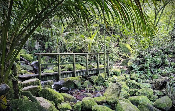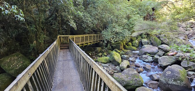 This section of the lower track takes you across the stream via a bridge and board walk that skirts around the edge of the cascading stream before you make your way up through the rocks and back into the bush.