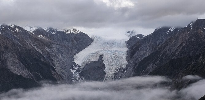 The iconic Franz Josef Glacier emerging between the cloud layers.