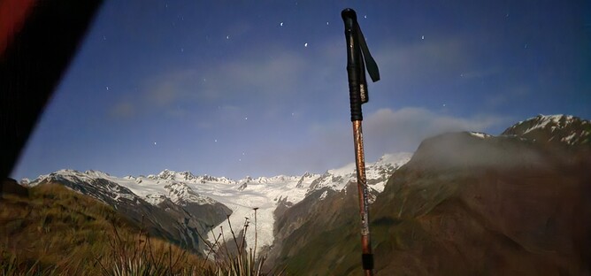 It was a beautifully clear night with the full moon lighting up the mountains and Glacier as I headed to bed. The next morning I was woken at 4am by two Kea having a conversation on either side of my tent. They didn't stop and fearing that their conversation would turn to vandalism I conceded and opened up my tent. Greeted by a great view of the starts above the mountain and my favourite birds, I really wasn't too upset about being awake earlier than planned! I packed my tent away and sat back to enjoy the sunrise.