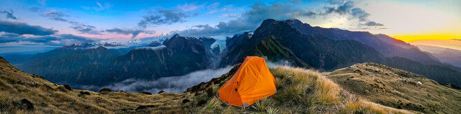 Around 2 hours and 45 minutes after leaving the car park, I made it to the Alex Knob. By now there were no views at all and the rain started coming over so I carried on past the sign post onto the plateau beyond and put my tent up in a position that I thought would allow me to see the glacier. It was an educated guess, but a good one, as when the cloud eventually gave way (just in time for sunset) I discovered that I had found the perfect spot to capture both the Glacier and West Coast view.