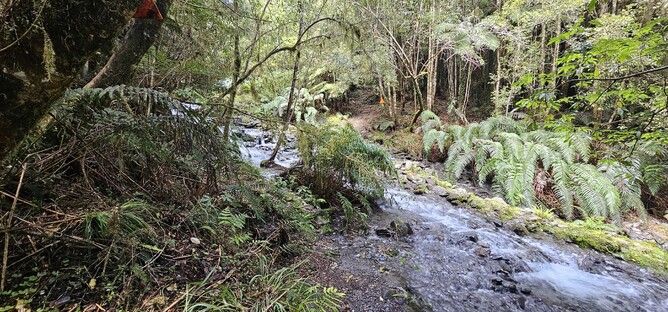 The amount of rain in the region means that this track is often muddy, but it also means the bush is incredible and it is a really nice start to the track picking your way carefully through to the stream crossing. I have been here after heavy rain and on a reasonably good day and I can't say I particularly remembered the stream crossing on either occasion, which suggests it was never particularly challenging. The two days prior to me doing the track on this occasion were quite rainy, yet there wasn't too much to negotiate. The picture below gives you a good idea of the level of the water.