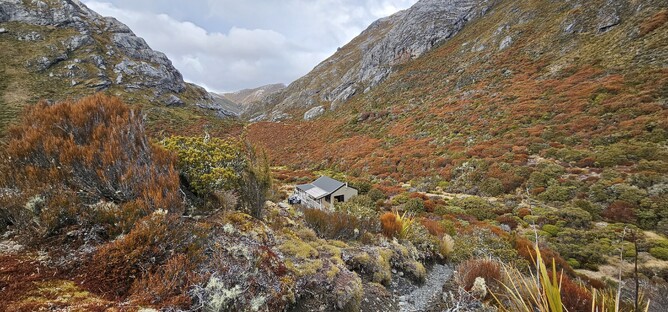 As I approached the end of the valley there was more purple coloured vegetation and you could see that the track was going to swing around to the right hand side. I hasn't been prepared for the fact that as soon as it did, I would be able to see the hut and instead of having to walk another hour, I would be there in 5 minutes. It was a welcome sight!