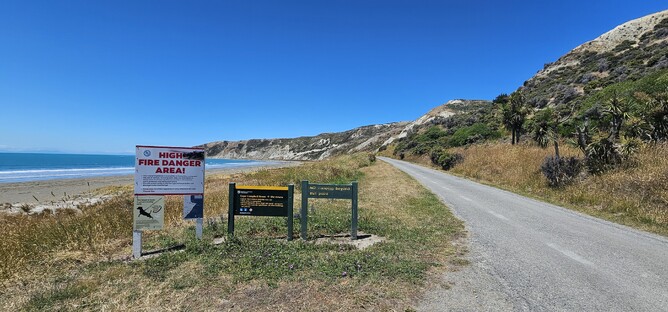 The track starts at the end of the road, around 300m after the Marfells Beach Campsite. You drive straight through the campsite to get there (also a great overnight option if you are wanting a place to stay). You can drive right through to the car park (beyond the signs pictured above) or can park here and walk along the beach.