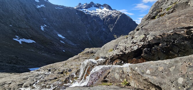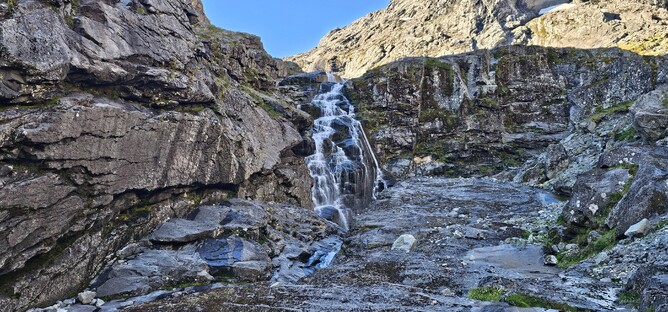 On this visit, there was still the remnants of snow from the winter lying on the side of the track below the waterfall that tumbles out from the lake above. You stay to the right of the Getrude stream, always looking out for markers up ahead. Eventually moving from the stony path across onto the big grey slabs of rock that you will recognise from any pictures taken of this route.