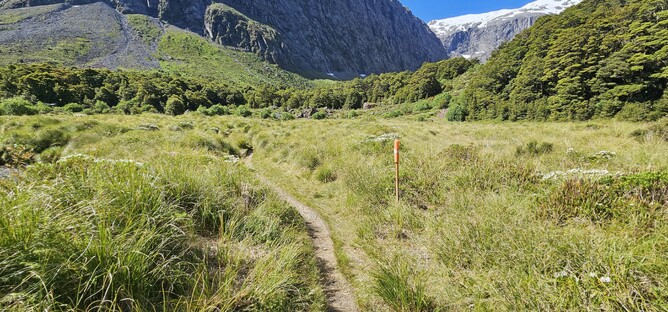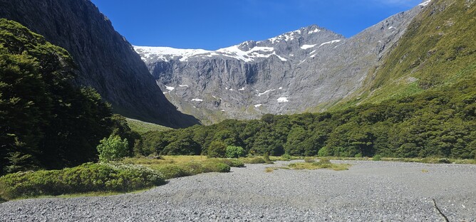 The walk starts from a gravel car park at the side of the Milford Road and is well formed and for the most part well signposted. Initially you follow along a stream bed along a clearly marked path, crossing over the riverbed (no water) and then continuing on into a short section of bush.
