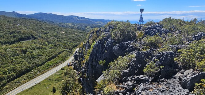 I had a bit of a look around and as I headed over to the bench I heard a group travelling up the Via Ferrata which emerged from the steep hillside in front of me. This is relatively new and can be accessed from lower down (well signposted) with gear available from Ngarua Caves which is a 5-minute drive down the road. I haven’t tried it personally, but looks like fun, and the group coming off at the top confirmed that! The views from here overlook the Takaka Valley and stretch out for miles. It’s a great place to stop for lunch on a nice day (though noting there isn’t much by way of shelter around).