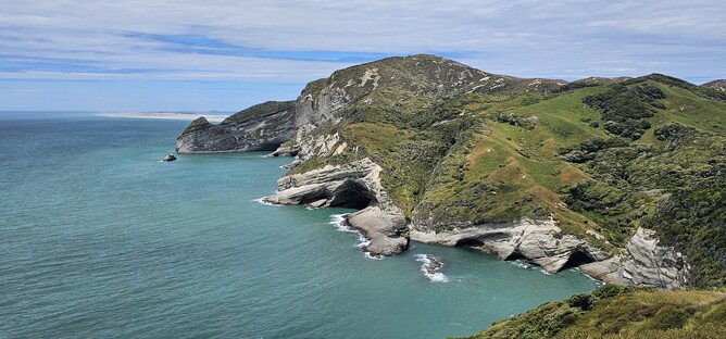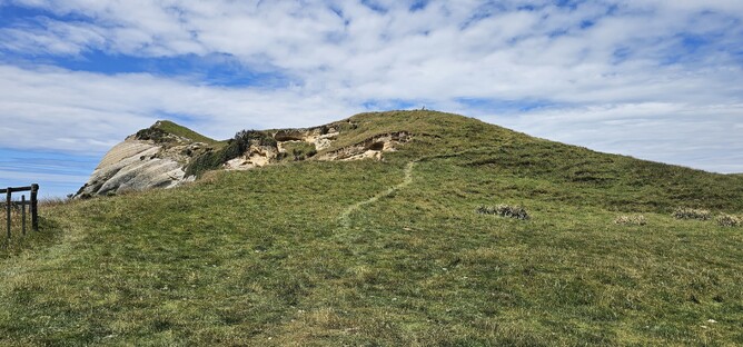 From here I decided to explore a bit further, so headed up the hill to the right of the viewpoint (if looking out to sea). Heading up the grassy farmland and following markers from the Puponga Hilltop Walk I headed in the direction of Farewell Spit. Staying away from the cliff edge, I followed the general direction out towards a point where I got great views of more white cliffs and the sand dunes which were now starting to get hidden by haze drifting over.